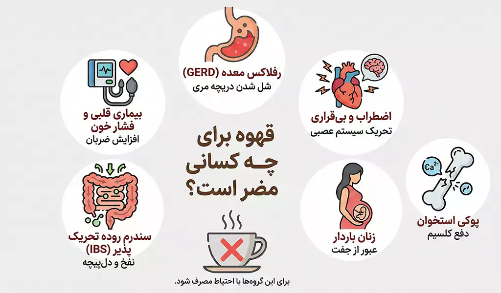 | مبتلایان به IBS (روده تحریکپذیر) | تحریک حرکات روده و ایجاد نفخ/اسهال | پرهیز از قهوه، بهویژه با شکم خالی. چای سبز گزینه ملایمتری است. |